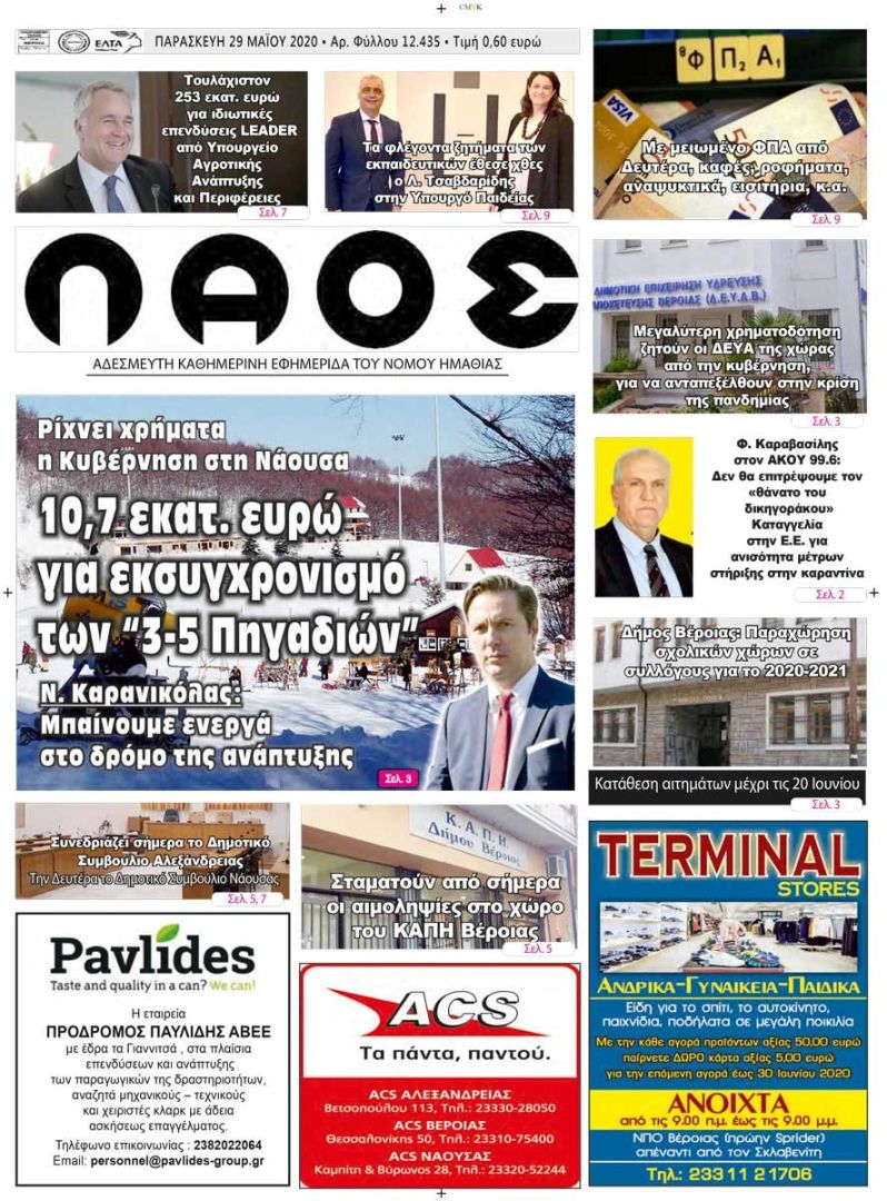 Πρωτοσέλιδο 29 Μαΐου 2020