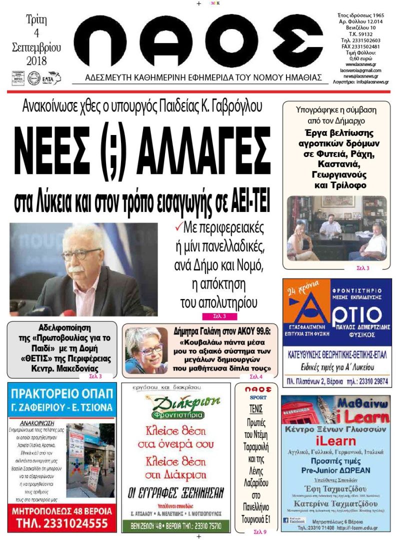 Πρωτοσέλιδο 4 Σεπτεμβρίου 2018