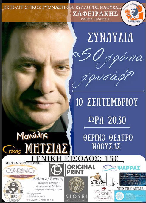 Το τμήμα χάντμπολ του Ζαφειράκη Νάουσας διοργανώνει μια μοναδική συναυλία, που αναμένεται να είναι το μεγαλύτερο event του φετινού καλοκαιριού! Στις 10 Σεπτεμβρίου, στο θερινό Δημοτικό θέατρο της πόλης μας, θα τραγουδήσει ο μεγάλος ερμηνευτής Μανώλης Μητσιάς σε μια συναυλία αφιερωμένη στα 50 χρόνια της καλλιτεχνικής του πορείας, στο χώρο του τραγουδιού, με τίτλο «50 χρόνια χρυσάφι».