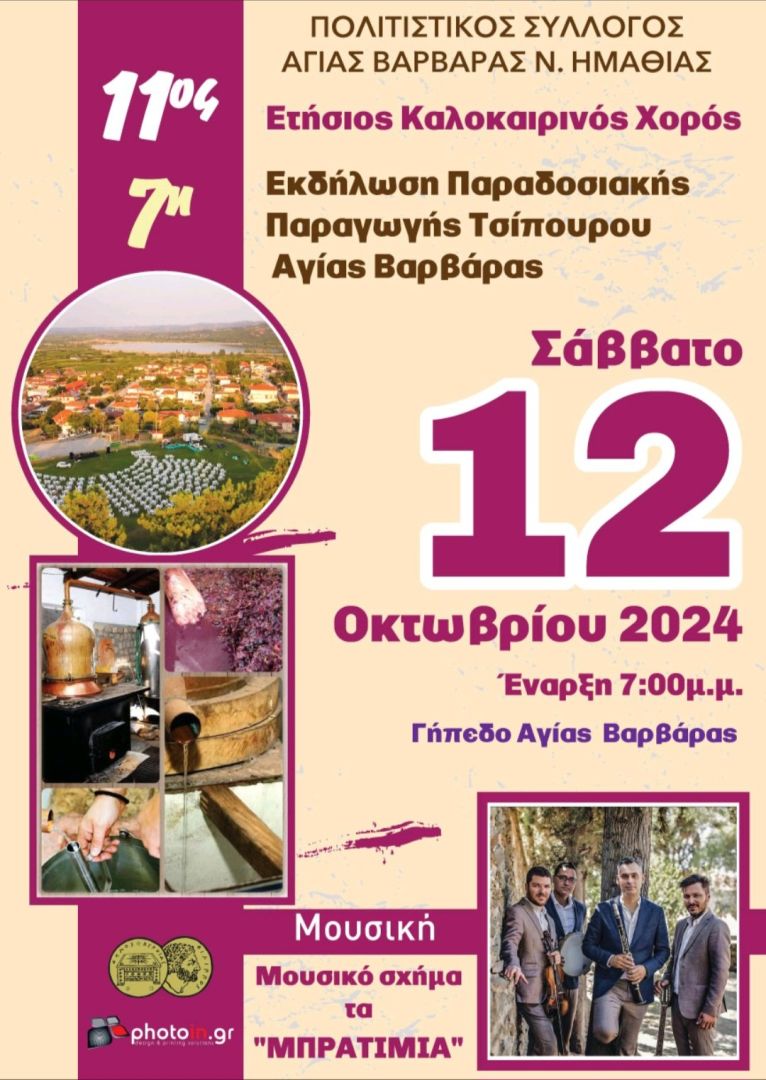 Mε νέα ημερομηνία, το Σάββατο 12 Οκτωβρίου 2024 και ώρα έναρξης 7.00 μ.μ., πραγματοποιείται ο 11ος Ετήσιος Καλοκαιρινός Χορός και η 7η Εκδήλωση Παραδοσιακής Παραγωγής Τσίπουρο Αγίας Βαρβάρας , που διοργανώνει ο Πολιτιστικός Σύλλογος, στο Γήπεδο Αγίας Βαρβάρας!