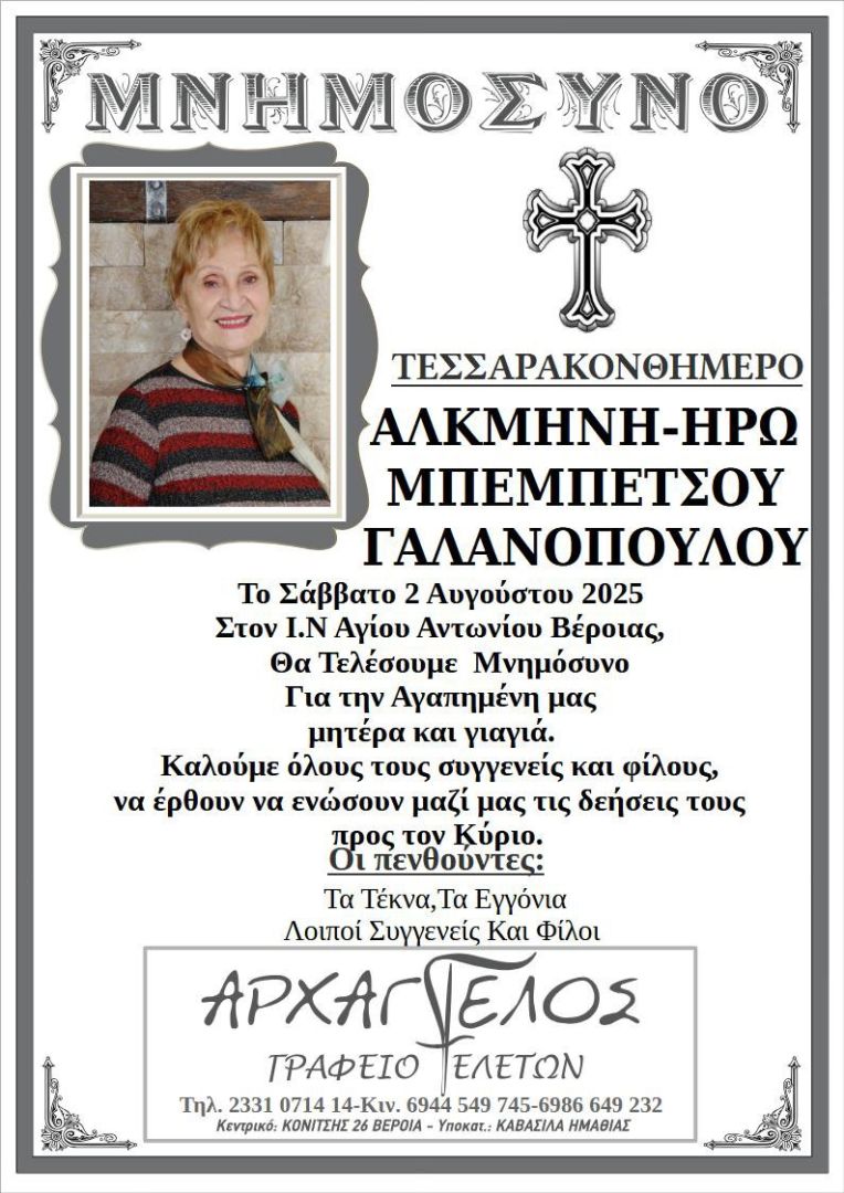 Τελούμε το Σάββατο 2 Αυγούστου 2025 στον Ιερό Ναό Αγίου Αντωνίου Βέροιας 40ΝΘΗΜΕΡΟ ΜΝΗΜΟΣΥΝΟ για την ανάπαυση της ψυχής της αγαπημένης μας μητέρας και γιαγιάς ΑΛΚΜΗΝΗ – ΗΡΩ ΜΠΕΜΠΕΤΣΟΥ ΓΑΛΑΝΟΠΟΥΛΟΥ και καλούμε όλους όσοι τιμούν τη μνήμη της να προσέλθουν και να ενώσουν μαζί μας τις δεήσεις τους προς το Θεό.