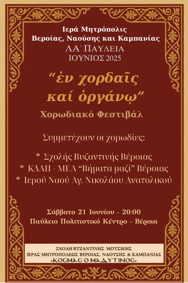 Μουσικής, διοργανώνει Χορωδιακό Φεστιβάλ με τίτλο: «Εν χορδαίς και οργάνω», το Σάββατο 21 Ιουνίου 2025 και ώρα 8:00
