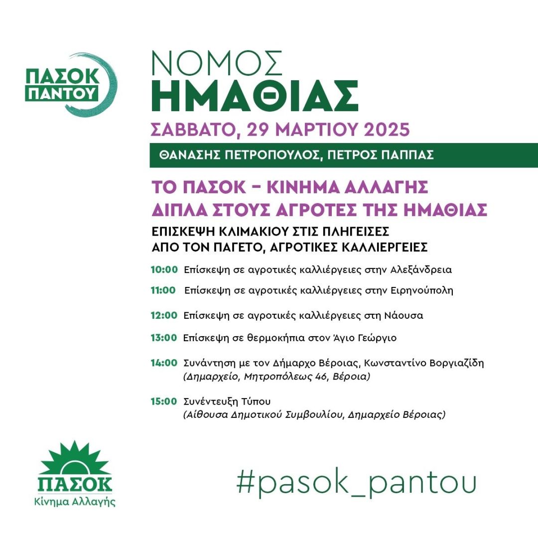 Το Σάββατο 29 Μαρτίου 2025 κλιμάκιο του ΠΑΣΟΚ – ΚΙΝΗΜΑ ΑΛΛΑΓΗΣ θα επισκεφθεί τις πληγείσες από τον παγετό, αγροτικές περιοχές. Στην περιοδεία συμμετέχουν ο Θανάσης Πετρόπουλος και ο Πέτρος Παππάς.