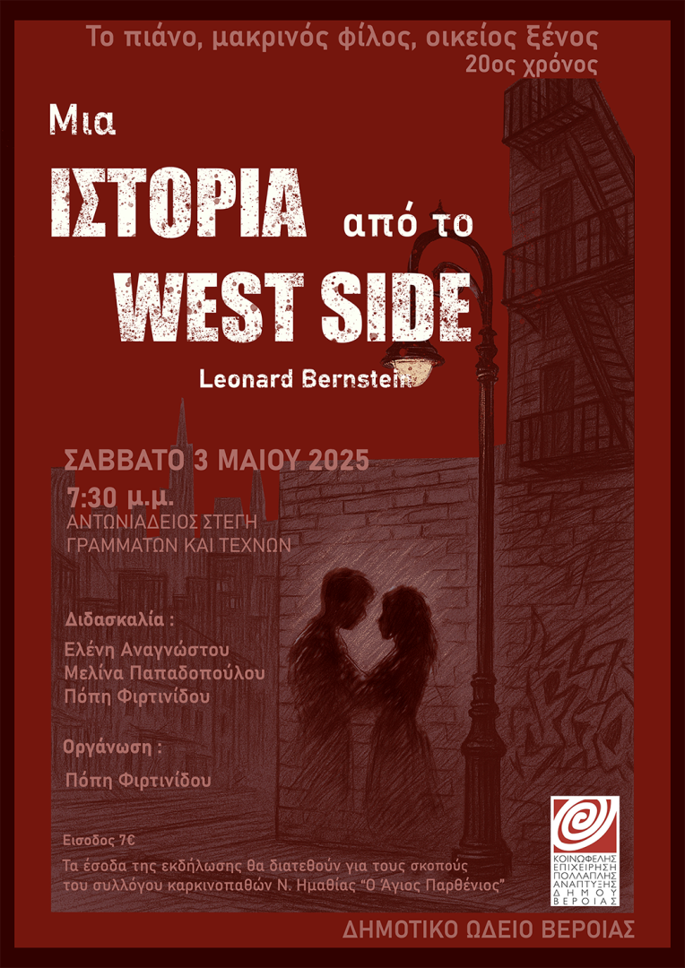 Η εκδήλωση, γεμάτη τραγούδι, χορό, πιάνο και ιστορίες από το West Side, θα πραγματοποιηθεί το Σάββατο 3 Μαΐου 2025 στις 7.30 μ.μ. και τα έσοδα, όπως κάθε χρόνο, θα διατεθούν στον Σύλλογο Καρκινοπαθών Ν. Ημαθίας «Ο Άγιος Παρθένιος». Είσοδος 7 ευρώ.