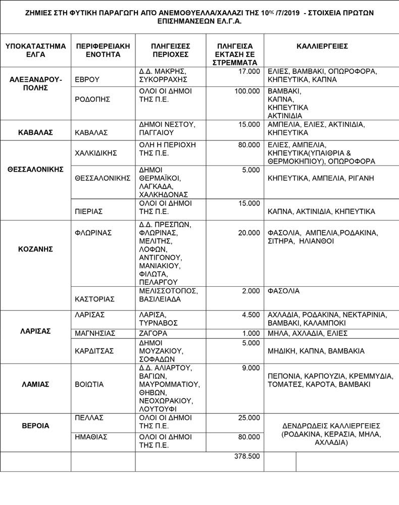 Σύμφωνα με την τελευταία ενημέρωση των εκτιμητών του ΕΛΓΑ, το μεσημέρι της Παρασκευής (12/7/2019) πληγείσες περιοχές υπάρχουν στις περιφερειακές ενότητες Έβρου, Ροδόπης, Καβάλας, Χαλκιδικής, Θεσσαλονίκης, Πιερίας, Φλώρινας, Καστοριάς, Λάρισας, Μαγνησίας, Καρδίτσας, Βοιωτίας, Πέλλας και Ημαθίας. Η έκταση σε στρέμματα των πληγεισών περιοχών ανέρχεται, μέχρι στιγμής, στα 378.500.