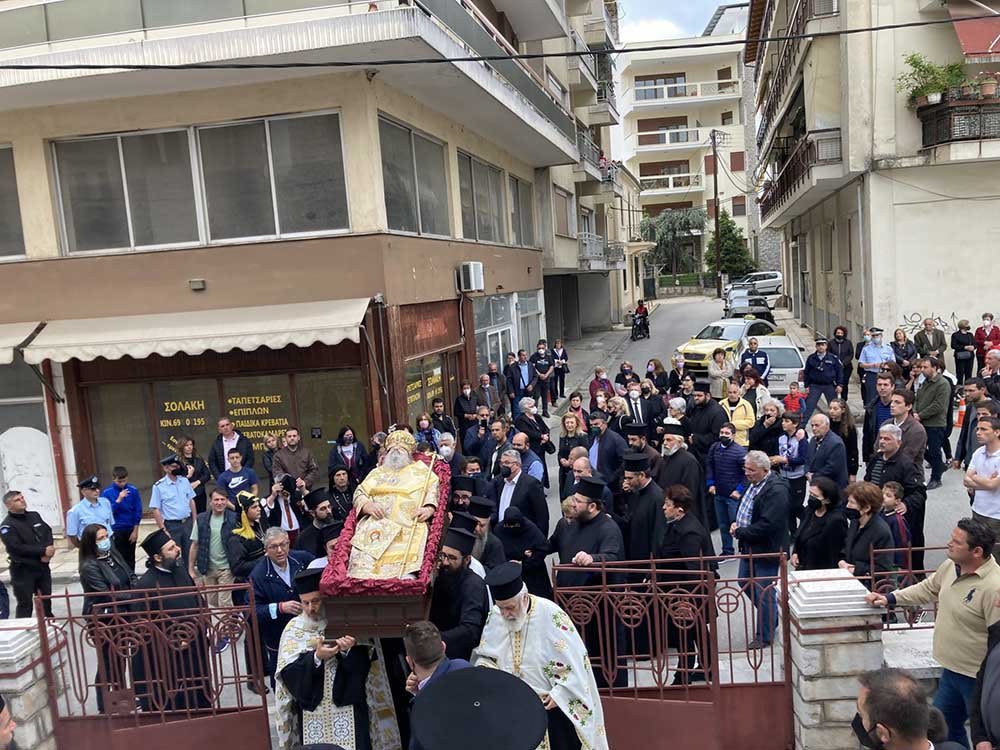 Εν πομπή το σκήνωμα μεταφέρθηκε στον Ιερό Μητροπολιτικό Ναό Εισοδίων της Θεοτόκου, όπου τελέστηκε επιμνημόσυνη δέηση.