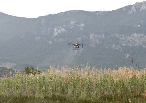 Η εναέρια καταπολέμηση γίνεται με τη χρήση ελικοπτέρων σε έκταση 280.000 στρεμμάτων. Κατά τους εναέριους ψεκασμούς πραγματοποιούνται δράσεις καταπολέμησης κυρίως προνυμφών αλλά και ακμαίων κουνουπιών όταν αυτό απαιτείται.