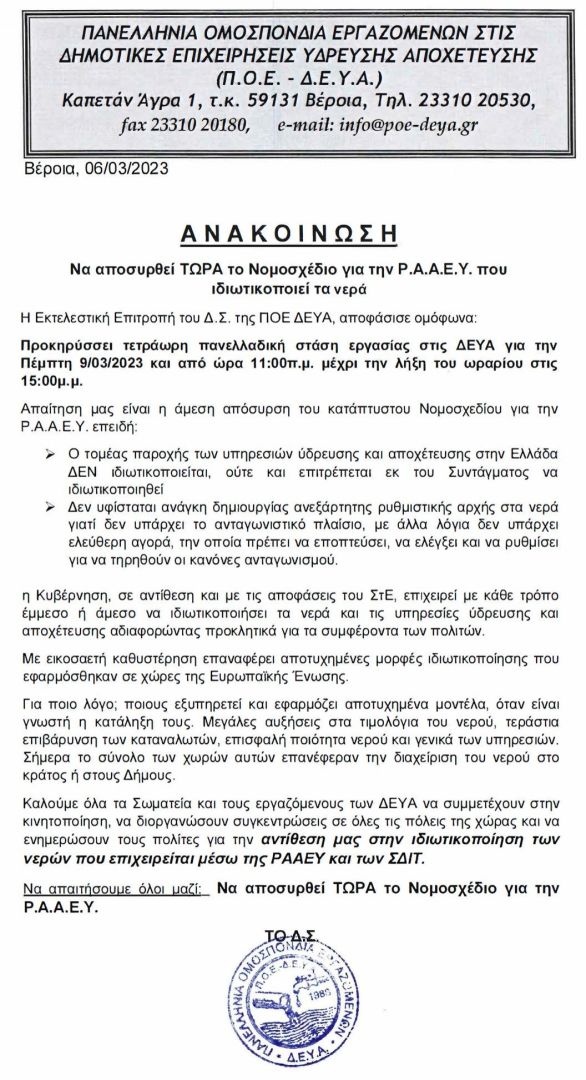 Σε στάση εργασίας και οι εργαζόμενοι της ΔΕΥΑΒ: “Να αποσυρθεί το Νομοσχέδιο που ιδιωτικοποεί τα νερά” – Η ανακοίνωση