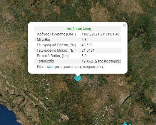 Ισχυρή σεισμή δόνηση μεγέθους 4,9 βαθμών της κλίμακας Ρίχτερ σημειώθηκε στις 00:31 μετά τα μεσάνυχτα, στην περιοχή της Καστοριάς, ωστόσο έγινε αντιληπτός και στην Ημαθία.