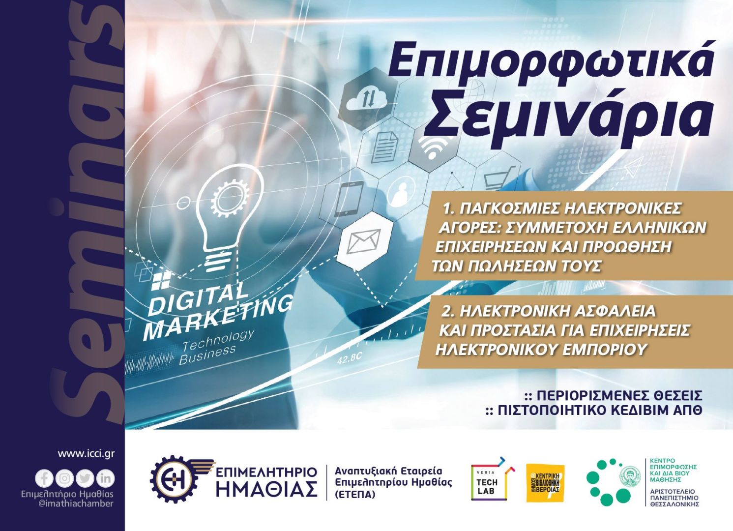 Η Αναπτυξιακή Εταιρεία του Επιμελητηρίου Ημαθίας (ΕΤΕΠΑ), σε συνεργασία με το Κέντρο Επιμόρφωσης και Δια Βίου Μάθησης του Αριστοτελείου Πανεπιστημίου Θεσσαλονίκης (ΚΕΔΙΒΙΜ ΑΠΘ) και με την υποστήριξη του Veria Tech Lab της Δημόσιας Κεντρικής Βιβλιοθήκης Βέροιας διοργανώνουν εξειδικευμένα επιμορφωτικά προγράμματα για τα μέλη του Επιμελητηρίου Ημαθίας και τους εργαζόμενους σε αυτά.