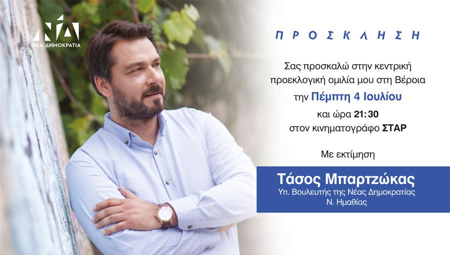 Νέας Δημοκρατίας Τάσος Μπαρτζώκας, σήμερα Πέμπτη 4 Ιουλίου στις 21.30, στον