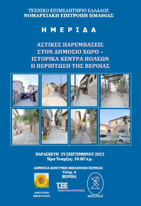 Το Τεχνικό Επιμελητήριο Ελλάδας – Τμήμα κεντρικής Μακεδονίας και η Νομαρχιακή Επιτροπή Ημαθίας του ΤΕΕ/ΤΚΜ διοργανώνουν την Παρασκευή, 29 Σεπτεμβρίου 2023, ημερίδα, με θέμα: ΠΑΡΕΜΒΑΣΕΙΣ ΣΤΟΝ ΔΗΜΟΣΙΟ ΧΩΡΟ ΚΑΙ ΙΣΤΟΡΙΚΑ ΚΕΝΤΡΑ ΠΟΛΕΩΝ – Η ΠΕΡΙΠΤΩΣΗ ΤΗΣ ΒΕΡΟΙΑΣ