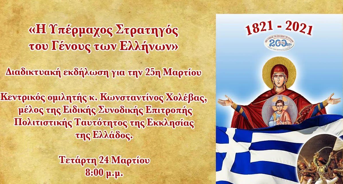 Παρακολουθείστε σήμερα Τετάρτη 24 Μαρτίου στις 8:00 μ.μ. την διαδικτυακή εκδήλωση της Ιεράς Μητροπόλεως μας για την εθνική και θρησκευτική εορτή της 25ης Μαρτίου με θέμα : «Η Υπέρμαχος Στρατηγός του Γένους των Ελλήνων», η οποία πραγματοποιείται στο πλαίσιο του εορτασμού των 200 ετών από την έναρξη της Ελληνικής Επαναστάσεως του 1821.
