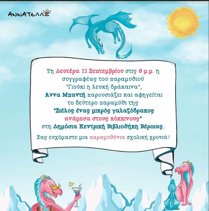 Τη Δευτέρα 11 Σεπτεμβρίου, στις 6 το απόγευμα, στην αίθουσα εκδηλώσεων της Δημόσιας Κεντρικής Βιβλιοθήκης της Βέροιας, η εκπαιδευτικός και συγγραφέας Άννα Μπαντή, παρουσιάζει και αφηγείται το παραμύθι της «Σιέλος ένας μικρός γαλαζόδρακος ανάμεσα στους κόκκινους».