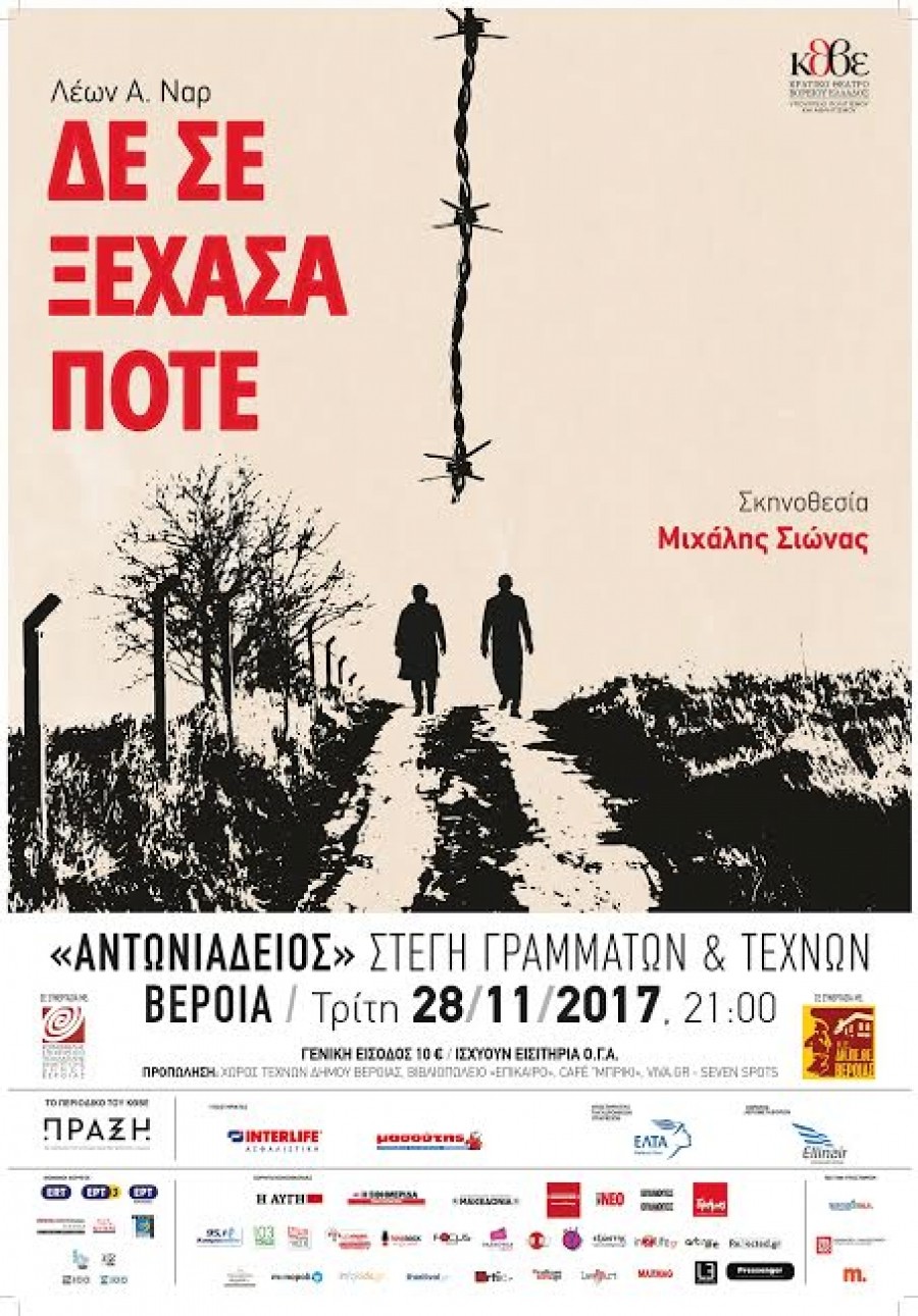 Η παραγωγή του ΚΘΒΕ «Δε σε ξέχασα ποτέ», σε σκηνοθεσία Μιχάλη Σιώνα,  μετά από ένα επιτυχημένο κύκλο παραστάσεων, παρουσιάζεται την Τρίτη 28 Νοεμβρίου, στην «Αντωνιάδειο Στέγη Γραμμάτων και Τεχνών» στη Βέροια στις 9.00 μ.μ., σε συνεργασία με την ΚΕΠΑ και το ΔΗΠΕΘΕ Βέροιας. Μια μουσικοθεατρική παράσταση για έναν έρωτα που, μετά από πολλές περιπέτειες, αν και ανεκπλήρωτος, αναζητά δικαίωση.