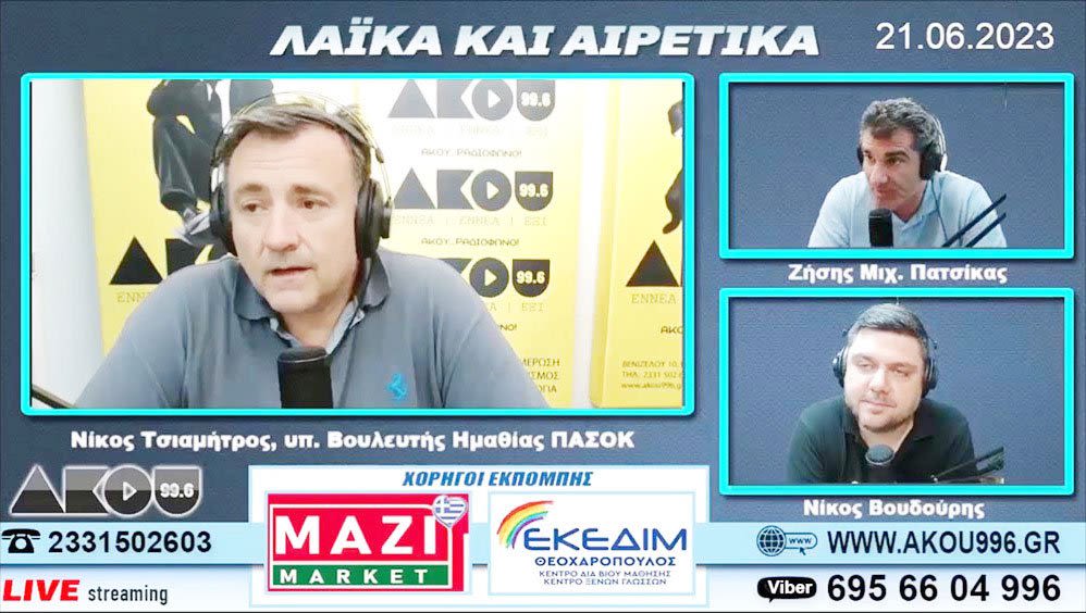 Στην εκπομπή «Λαϊκά και Αιρετικά» του ΑΚΟΥ 99.6 μίλησε το μεσημέρι της Τετάρτης(21/6) ο υποψήφιος βουλευτής Ημαθίας του ΠΑΣΟΚ (πρώτος στην λίστα) Νίκος Τσιαμήτρος.