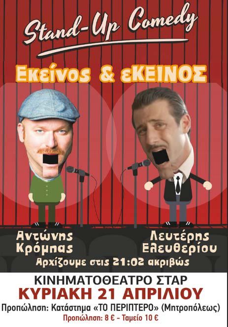 O Λευτέρης Ελευθερίου και ο Αντώνης Κρόμπας είναι ‘’εκείνος κι εκείνος’’ όπου σε ένα καταιγιστικό δίωρο σχολιάζουν, σατιρίζουν, υποκρίνονται, εκνευρίζουν κι ερεθίζουν το κοινό.. του θέτουν ερωτήματα του απαγγέλουν ποιήματα του κάνουν τράκα χρήματα του συγχωρούν τα κρίματα και άμα δεν έρθεις να τους δεις μπροστά σου φίλε θα το βρεις … γιατί εχει ο καιρός γυρίσματα απαντάν σε προσβολές.. στελνουν κατάρες και απειλές σε ρωτάει, Aν θέλεις λες αν εισαι down φεύγεις up κι αν δε γουστάρεις τελικά κάτσε στη θεσούλα σου…. την Κυριακή 21 Απριλίου στις 9.02 το βράδυ, στο κινηματοθέατρο ΣΤΑΡ της Βέροιας.