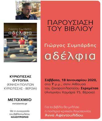 Στη Βέροια θα βρίσκεται το Σάββατο 18 Ιανουαρίου, ο συγγραφέας Γιώργος Συμπάρδος, καλεσμένος της «Κίνησης Πολιτών Κυριώτισσας» για την παρουσίαση του βραβευμένου λογοτεχνικού του έργου και συγκεκριμένα του νέου του βιβλίου «Αδέλφια» που κυκλοφορεί απο τις εκδόσεις ΜΕΤΑΙΧΜΙΟ. Η εκδήλωση θα γίνει στο ζαχαροπλαστείο Σερεμέτα, στις 7.00 μ.μ. και τον συγγραφέα θα συνοδεύει η φιλόλογος, ποιήτρια και βιβλιοκριτικός Άννα Αφεντουλίδου, η οποία θα μιλήσει για το βιβλίο..