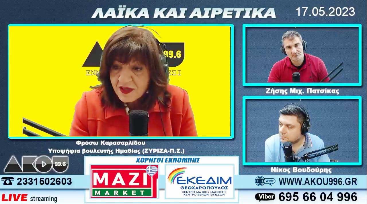 Στην ραδιοφωνική εκπομπή του ΑΚΟΥ 996 “Λαϊκά και Αιρετικά” με τους Ζήση Μιχ. Πατσίκα και Νίκο Βουδούρη ήταν καλεσμένη την Τετάρτη 17 Μαΐου 2023 η υποψήφια βουλευτής Ημαθίας με τον ΣΥΡΙΖΑ – ΠΣ, Φρόσω Καρασαρλίδου.