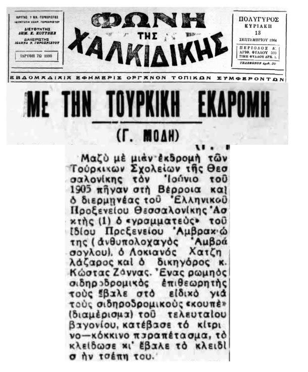 Μαζὺ μὲ μιὰν ἐκδρομὴ τῶν Τουρκικῶν Σχολείων τῆς Θεσσαλονίκης τὸν Ἰούνιο τοῦ 1905 πῆγαν στὴ Βέρροια καὶ ὁ διερμηνέας τοῦ Ἑλληνικοῦ Προξενείου Θεσσαλονίκης Ἀσκητής[5], ὁ «γραμματεὺς» τοῦ ἰδίου Προξενείου Ἀμβρακιώτης (ἀνθυπολοχαγὸς Ἀμβράσογλου), ὁ Λουκιανὸς Χατζηλάζαρος καὶ ὁ δικηγόρος κ. Κώστας Ζάννας. Ἕνας ρωμηὸς σιδηροδρομικὸς ἐπιθεωρητὴς τοὺς ἔβαλε στὸ εἰδικὸ γιὰ τοὺς σιδηροδρομικοὺς «κουπὲ» (διαμέρισμα) τοῦ τελευταίου βαγονίου, κατέβασε τὸ κίτρινο-κόκκινο παραπέτασμα, τὸ κλείδωσε κι᾿ ἔβαλε τὸ κλειδὶ στὴν τσέπη του.