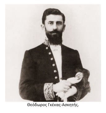 [5] Θεόδωρος Γκέκας (1872-1908), ο επονομαζόμενος Ασκητής (σχετ. το εδώ παρατιθέμενο απόσπασμα του Α. Χριστοδούλου, σημ. [1])• ο Μικρασιάτης πρώτος διερμηνέας (από το 1901) του Ελληνικού Προξενείου Θεσσαλονίκης και «εθνομάρτυς της Μακεδονίας», δολοφονηθείς στην Θεσσαλονίκη υπό Βουλγάρων εν μέση οδώ (22-02-1908).