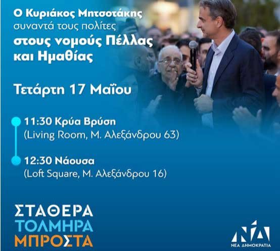 Η Διοικούσα Επιτροπή Νέας Δημοκρατίας Ημαθίας, ενημερώνει ότι σήμερα Τετάρτη 17 Μαΐου στις 12:00μ, θα επισκεφθεί την Νάουσα ο Πρόεδρος της Νέας Δημοκρατίας Κυριάκος Μητσοτάκης όπου θα έχει συνάντηση με πολίτες, στο καφέ Loft Square, Μεγάλου Αλεξάνδρου 16-Νάουσα.
