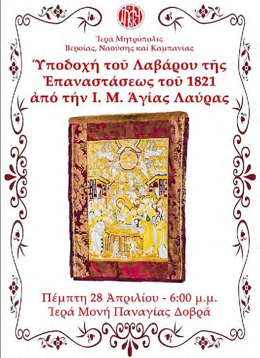 Με ανακοίνωσή της η Ιερά Μητρόπολη Βεροίας, Ναούσης και Καμπανίας μας πληροφορεί ότι την Πέμπτη 28 Απριλίου στις 6 το απόγευμα θα γίνει στην Ιερά Μονή Παναγίας Δοβρά η υποδοχή του Λαβάρου της Επανάστασης και θα τελεστεί Πανηγυρικός Πολυαρχιερατικός Εσπερινός της Ζωοδόχου Πηγής. Την Παρασκευή 29 Απριλίου, το πρωί, ημέρα που πανηγυρίζει η Μονή, θα τελεστεί Όρθρος, Πολυαρχιερατική Θεία Λειτουργία και Αγιασμός. Στην συνέχεια το Σάββατο 30 Απριλίου στις 6:00 το απόγευμα, η ηρωική πόλη της Νάουσας της Νάουσας, θα υποδεχτεί το ιστορικό Λάβαρο της Επαναστάσεως, στον Ιερό Ναό του Αγίου Γεωργίου Νάουσας.