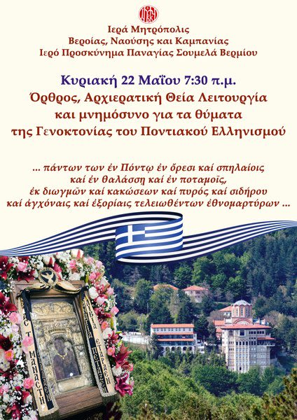 Ἡ Ἱερά Μητρόπολις Βεροίας, Ναούσης καί Καμπανίας, καλεῖ ἅπαντα τόν εὐσεβῆ λαό τῆς Μητροπόλεώς μας, τήν Κυριακή 22 Μαΐου στό Ἱερό προσκύνημα τῆς Παναγίας Σουμελᾶ στό Βέρμιο, νά τιμήσει μέ τήν παρουσία του τήν μνήμη τῶν ἀδίκως σφαγιασθέντων Ποντίων ἀδελφῶν μας.