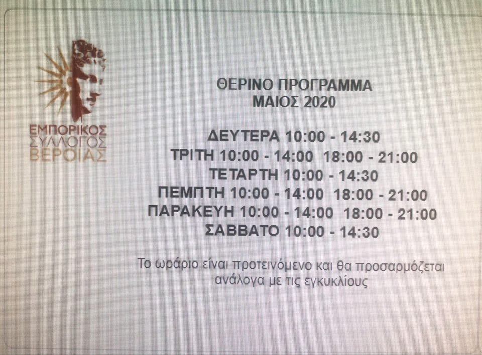Το Δ.Σ. του εμπορικού συλλόγου Βέροιας ανακοινώνει το προσωρινό πρόγραμμα που θα ισχύει από την Δευτέρα 04/05/2020 για τα καταστήματά των οποίων ο πρώτος ΚΑΔ ανοίγει βάση την εγκύκλιο του υπουργείου.