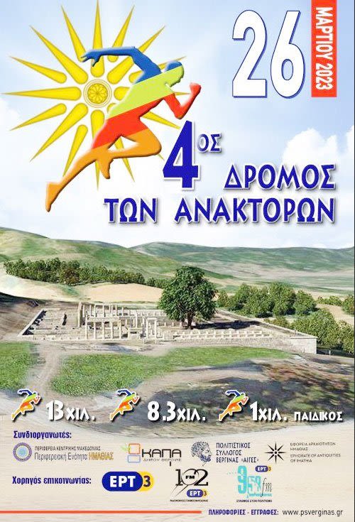 Ο Πολιτιστικός και Μορφωτικός Σύλλογος Βεργίνας «Αιγές» σε συνδιοργάνωση με Περιφερειακή Ενότητα Ημαθίας ΚΑΠΑ Δήμου Βέροιας Εφορεία Αρχαιοτήτων Ημαθίας διοργανώνουν τον 4ο Δρόμο των Ανακτόρων Με αγώνες 13 χλμ , 8,3 χλμ και 1 χλμ για παιδιά
