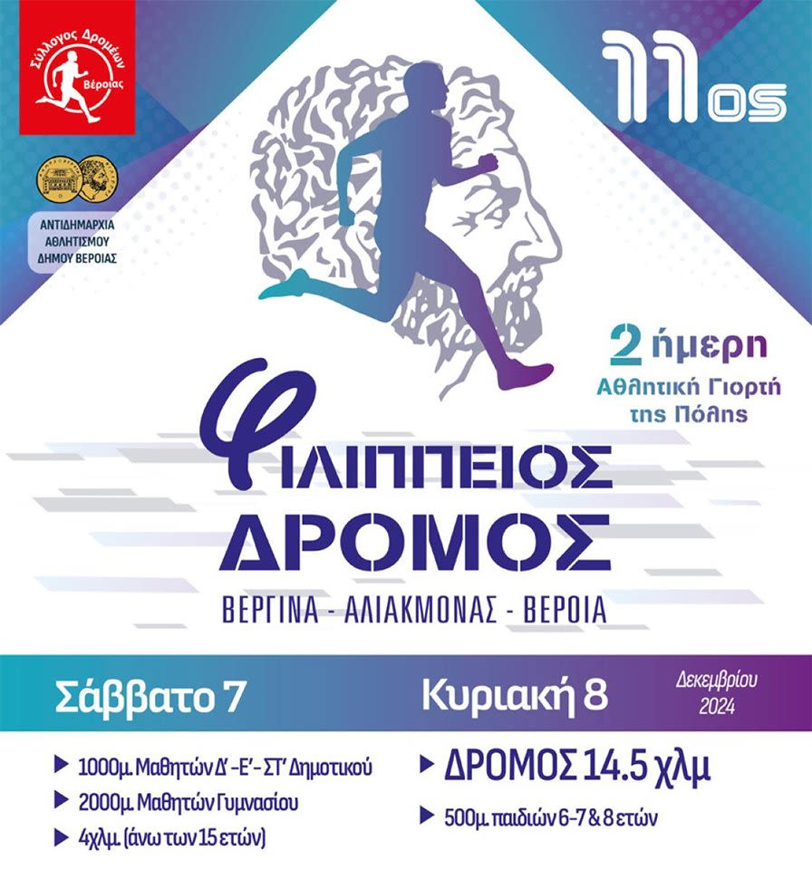 Ο Σύλλογος δρομέων Βέροιας και η Αντιδημαρχία Αθλητισμού του Δήμου Βέροιας, ανακοινώνουν την ημερομηνία διεξαγωγής του λαϊκού αγώνα δρόμου «11ος ΦΙΛΙΠΠΕΙΟΣ ΔΡΟΜΟΣ 14.5χλμ», την Κυριακή 8 Δεκεμβρίου 2024 και τους παράλληλους νυχτερινους αγώνες (4χλμ άνω των 15 ετών – 2χλμ γυμνασίων – 1χλμ Δημοτικού) που θα διεξαχθούν το Σάββατο 7 Δεκεμβρίου 2024.