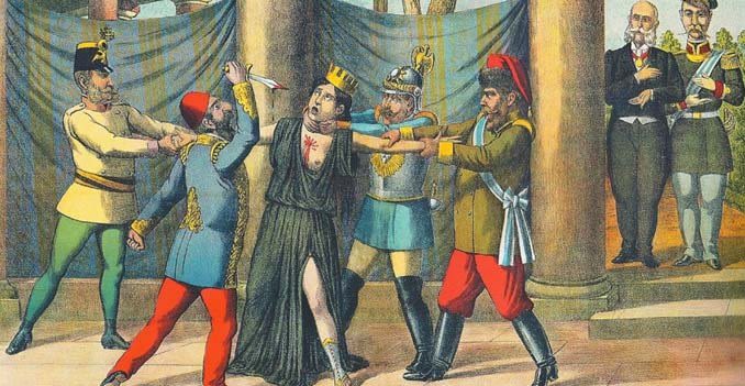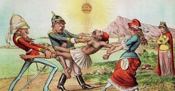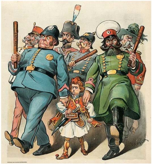 Οι παρατιθέμενες εικόνες είναι λιθογραφίες εφημερίδων του 19ου αι. με θεματογραφία “οι σχέσεις της Ελλάδας με τους δανειστές-συμμάχους της” από όπου προέκυψε και το απόφθεγμα της “Μικράς πλην τιμίας Ελλάδος”.