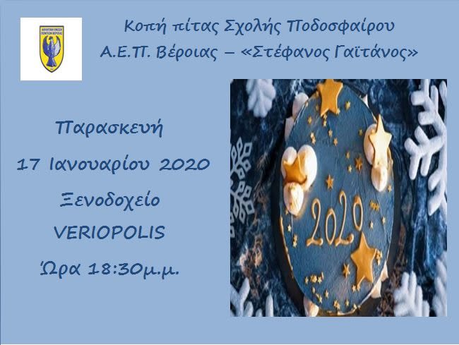 «Η Σχολή Ποδοσφαίρου Α.Ε.Π. Βέροιας- «Στέφανος Γαϊτάνος» καλεί τους ποδοσφαιριστές της αντρικής ομάδας και των τμημάτων υποδομής της, καθώς και τους προπονητές της στην κοπή πίτας για το 2020, που θα πραγματοποιηθεί την Παρασκευή 17 Ιανουαρίου 2020 στο ξενοδοχείο VERIOPOLIS και ώρα 18:30 μ.μ.