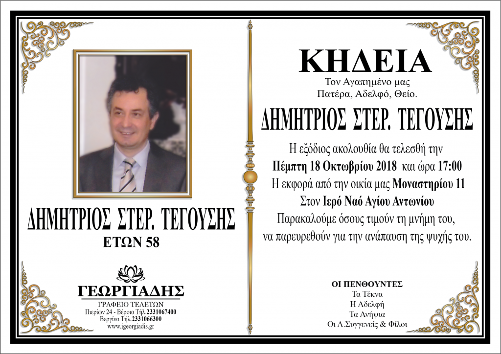ετών έφυγε χθες βράδυ από τη ζωή ο Δημήτρης Τεγούσης, στέλεχος επί πολλά χρόνια στο οικονομικό Τμήμα του Δήμου Βέροιας.