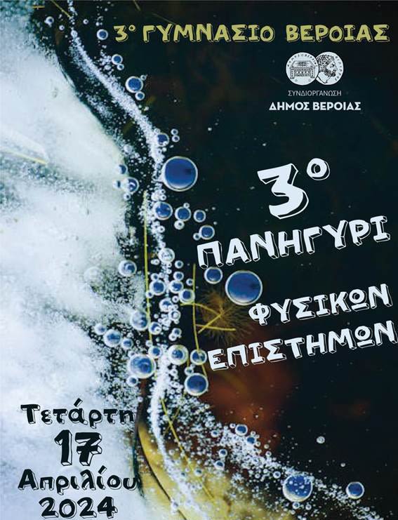 Το 3ο Γυμνάσιο Βέροιας συνδιοργανώνει με τον Δήμο Βέροιας, για άλλη μια χρονιά, ανοικτή εκδήλωση με τίτλο «3ο Πανηγύρι Φυσικών Επιστημών», την Τετάρτη 17 Απριλίου 2024, ΣΤΟΝ ΧΩΡΟ ΤΕΧΝΩΝ (αντί για το πάρκο Εληάς λόγω καιρού) και από ώρα 10:00 έως 14:00.