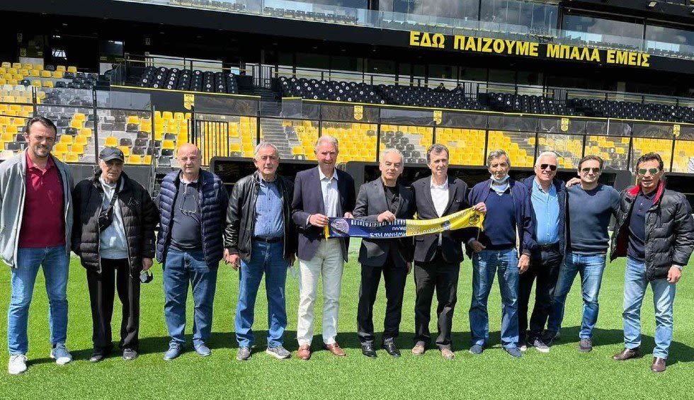 Η συνάντηση έγινε μέσα στον αγωνιστικό χώρο του Χαριλάου, με τους παλαίμαχους ποδοσφαιριστές να προσφέρουν στον Αριστείδη Καμπανό τα αναμνηστικά από το πρόσφατο φιλικό που έγινε στο Νέο Ηράκλειο της Αθήνας στη μνήμη του Άλκη.