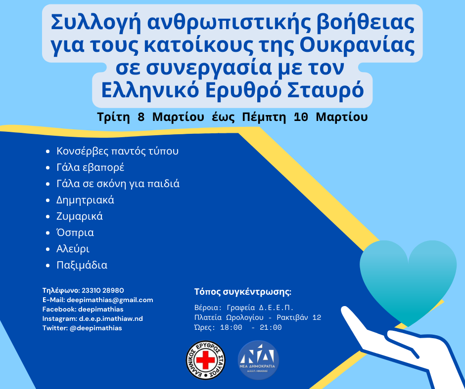 Η συλλογή των αγαθών για την Ημαθία θα πραγματοποιηθεί στα γραφεία της Νέας Δημοκρατίας (Πλατεία Ωρολογίου – Ρακτιβάν 12, 1ος όροφος) από Τρίτη 8 Μαρτίου έως και Πέμπτη 10 Μαρτίου και ώρες από τις 18:00 έως τις 21:00.