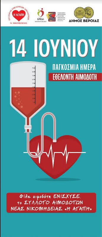 Αρκετοί από εμάς έχουμε βιώσει την αγωνία εύρεσης αίματος όταν κάποιος δικός μας άνθρωπος το χρειάζεται. Τελευταία στιγμή, με την ψυχή στο στόμα, αναζητούμε ανάμεσα σε συγγενείς και φίλους αυτόν ή αυτούς που θα μπορέσουν να προσφέρουν μια φιάλη αίμα για τον δικό μας άνθρωπο. Γι’ αυτό και καλούμε τους φίλους μας εθελοντές αιμοδότες, με αφορμή την Παγκόσμια Ημέρα του Εθελοντή Αιμοδότη, να ενισχύσουν το Σύλλογο μας Νέας Νικομήδειας <<Η ΑΓΑΠΗ>> στο Νοσοκομείο Βέροιας προκειμένου να έχουμε τη δυνατότητα να καλύψουμε την ανάγκη σε αίμα όσο το δυνατόν περισσότερων από εμάς που κάποια στιγμή ενδεχομένως βρεθούμε στη δυσάρεστη θέση να αντιμετωπίσουμε ένα χειρουργείο ή ακόμα και έντονη αιμορραγία.