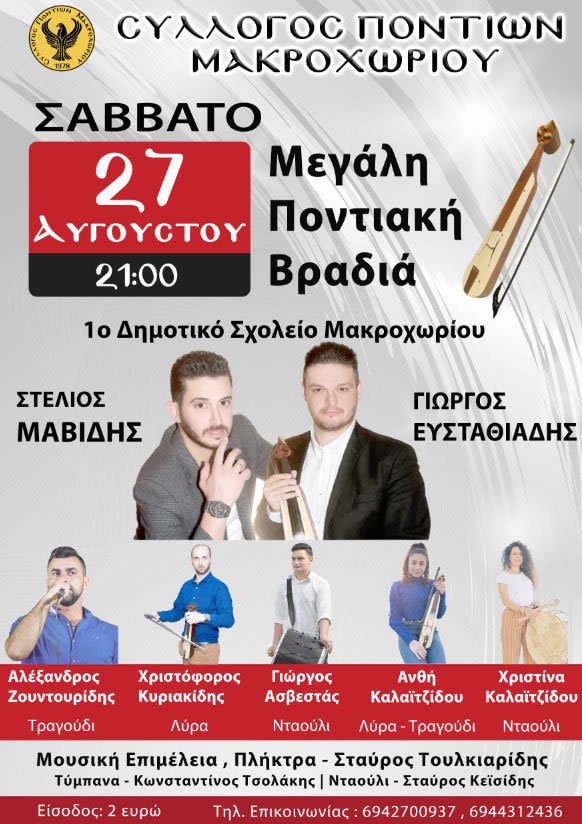 Ο «Σύλλογος Ποντίων Μακροχωρίου» διοργανώνει την 2η καλοκαιρινή εκδήλωση του, η οποία πραγματοποιείται το Σάββατο 27 Αυγούστου 2022 με ώρα έναρξης 21:00, στον προαύλιο χώρο του 1ου Δημοτικού Σχολείο Μακροχωρίου. Ο σύλλογος μας συμμετέχει ανελλιπώς στις καθιερωμένες εκδηλώσεις εορτασμού του Τιμίου Προδρόμου στο Μακροχώρι, κάθε χρόνο στις 27 Αυγούστου. Στην εκδήλωση, συμμετέχουν τα χορευτικά τμήματα του συλλόγου μας και μεγάλο καλλιτεχνικό πρόγραμμα.