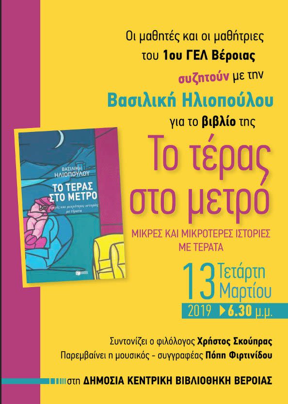 Οι μαθητές και οι μαθήτριες του 1ου ΓΕΛ Βέροιας συζητούν με την Βασιλική Ηλιοπούλου για το βιβλίο της «Το Τέρας στο μετρό: μικρές και μικρότερες ιστορίες με τέρατα» την Τετάρτη 13 Μαρτίου 2019, στις 6.30 το απόγευμα, στην αίθουσα εκδηλώσεων της Δημόσιας Κεντρικής Βιβλιοθήκης της Βέροιας.