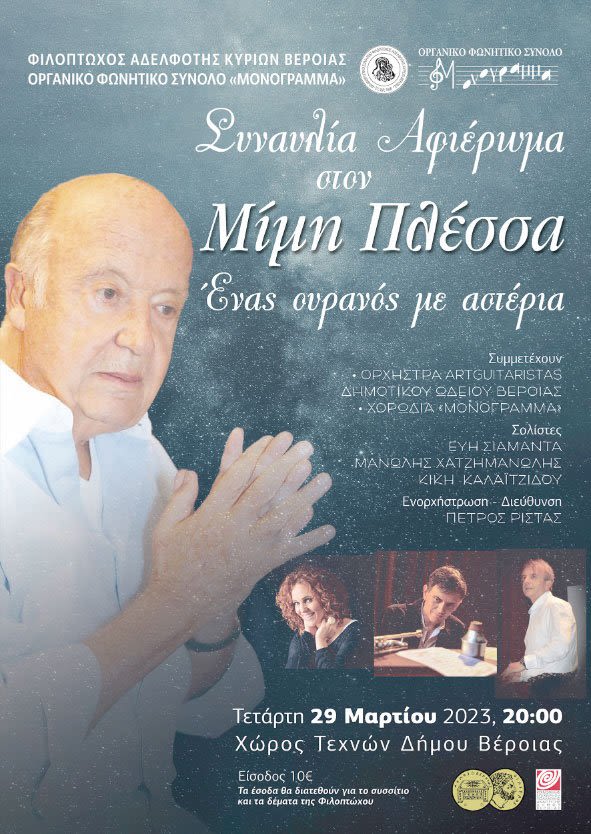 Η Φιλόπτωχος Αδελφότητα Κυριών Βέροιας, διοργανώνει σε συνεργασία με τη χορωδία Οργανικό Φωνητικό Σύνολο «ΜΟΝΟΓΡΑΜΜΑ» Συναυλία – Αφιέρωμα στον Μίμη Πλέσσα, την Τετάρτη 29 Μαρτίου 2023 και ώρα 20.00΄, στο Χώρο Τεχνών Δήμου Βέροιας. Εισιτήρια διατίθενται στην εστία μας Κωτουνίου 10Α, από τις 9.30΄- 12.30΄, από τα μέλη του Δ.Σ. και από το Χώρο Τεχνών. Τηλ. Επικοινωνίας: 2331064731, 6946425960, 5946023827, 6948748093, 2331078100.