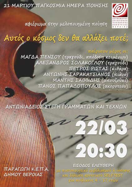 Κύρια αποστολή του φορέα πολιτισμού είναι η παραγωγή καλλιτεχνικών δράσεων. Έτσι επέλεξε την παγκόσμια ημέρα Ποίησης, να παρουσιάσει μελοποιήσεις έργων Eλλήνων κυρίως ποιητών, με τη συμβολή καταξιωμένων καλλιτεχνών του τόπου μας. Την ηθοποιό κυρία Μάγδα Πένσου σε απόδοση κειμένων και τραγουδιών, τον τραγουδιστή κύριο Αλέξανδρο Σολάκογλου, τον κύριο Πέτρο Ρίστα στην κιθάρα, τον κύριο Αντώνη Σαρακατσιάνο στο πιάνο, τον κύριο Μάντη Σαββίδη στο μπουζούκι και τον κύριο Παναγιώτη Παπαδόπουλο στο ακορντεόν. Ο τίτλος της συναυλίας : “ Αυτός ο κόσμος δεν θα αλλάξει ποτέ;” δανεισμένος από ποίημα του αείμνηστου Νίκο Γάτσου, προσθέτοντας ένα ερωτηματικό που ίσως μας εκφράζει σήμερα ως κοινωνία, με όλα.όσα συμβαίνουν γύρω μας!