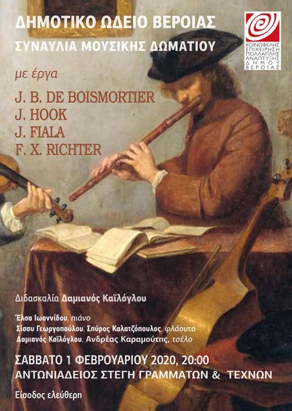 πραγματοποιηθεί συναυλία μουσικής δωματίου με έργα των : J. B. De Boismortier, J. Hook, J. Fiala, F. X. Richter.
