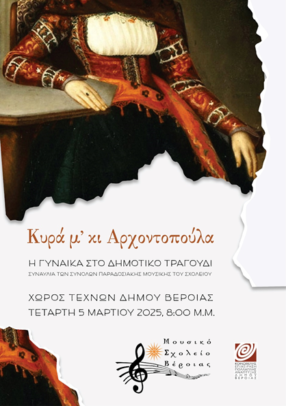 Το Μουσικό Σχολείο Βέροιας σας προσκαλεί στη συναυλία των Συνόλων Παραδοσιακής Μουσικής, με θέμα τη Γυναίκα στο Δημοτικό Τραγούδι, στον Χώρο Τεχνών, την Τετάρτη 5 Μαρτίου 2025, στις 8:00 μμ,. Διδασκαλία ορχήστρας Μπαλιάκας Γιάννης, Κυριάκος Κατσαβός, Σαρακατσιάνος Αντώνης ,Κουρτελής Δημήτρης, Μήλιος Νίκος. Διεύθυνση και διδασκαλία χορωδίας Κουτσιμανής Ιορδάνης.