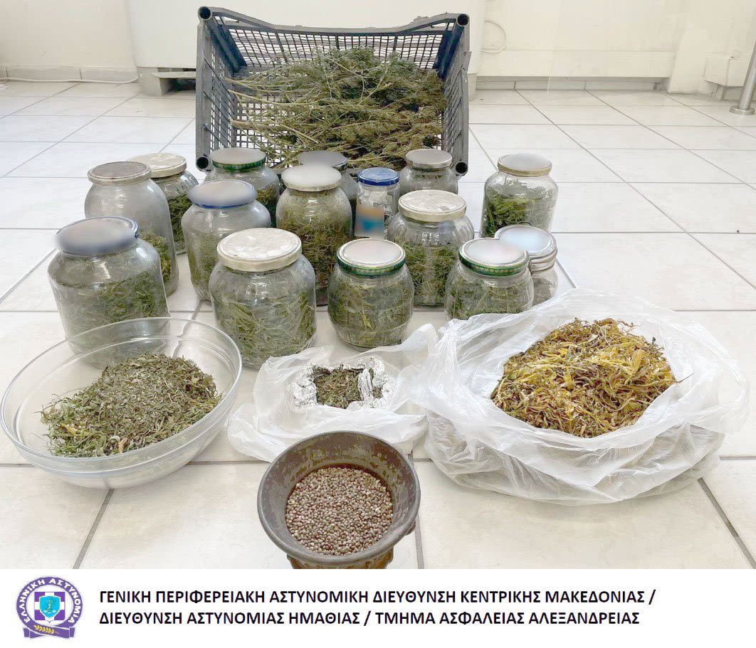 Συνελήφθη στις 31 Οκτωβρίου 2023 το πρωί σε περιοχή της Ημαθίας, από αστυνομικούς του Τμήματος Ασφάλειας Αλεξάνδρειας, ημεδαπός άνδρας, καθώς σε έρευνα που πραγματοποιήθηκε στην οικία του, με τη συνδρομή του αστυνομικού σκύλου ανίχνευσης ναρκωτικών ουσιών της Διεύθυνσης Αστυνομίας Σερρών, εντοπίστηκαν σε αποθήκη στον αύλειο χώρο της οικίας συνολική ποσότητα κάνναβης βάρους 950,4 γραμμαρίων, φυτικά αποσπάσματα κάνναβης βάρους 130,3 γραμμαρίων και σπόροι κάνναβης βάρους 190,6 γραμμαρίων.