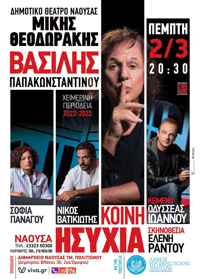 Συνεχίζεται η προπώληση των εισιτηρίων για την μουσικοθεατρική παράσταση του Βασίλη Παπακωνσταντίνου και του Οδυσσέα Ιωάννου, με τίτλο «Κοινή Ησυχία», που διοργανώνεται με την υποστήριξη του Δήμου Νάουσας και θα παρουσιαστεί στο κοινό, την Πέμπτη 2 Μαρτίου 2023, στις 20:30 στο Δημοτικό Θέατρο «Μίκης Θεοδωράκης».