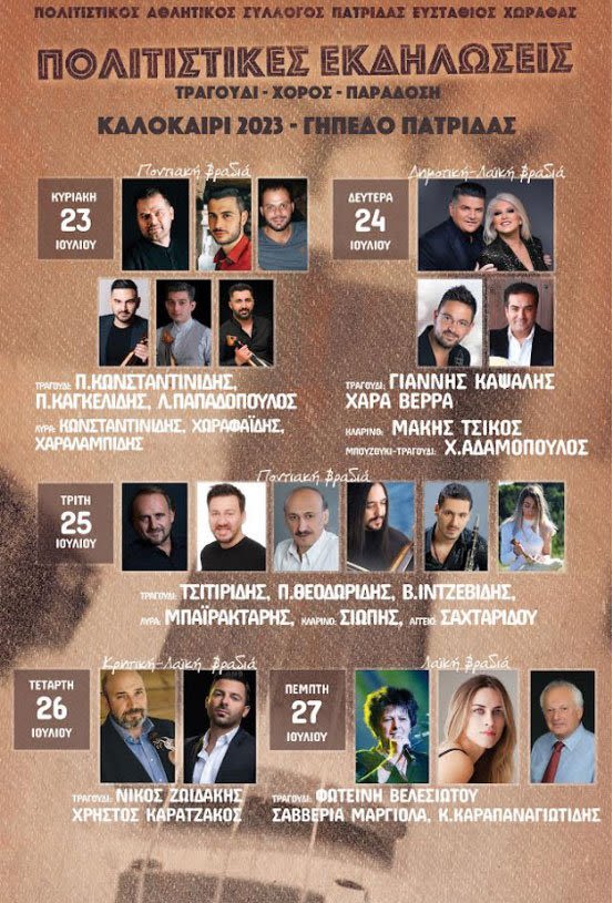 Ξεκίνησαν την Κυριακή 23 Ιουλίου 2023 και συνεχίζονται μέχρι τις 26 Ιουλίου, οι πενθήμερες εκδηλώσεις στην Πατρίδα Δήμου Βέροιας, που διοργανώνει ο Πολιτιστικός Σύλλογος Πατρίδας «Ευστάθιος Χωραφάς».