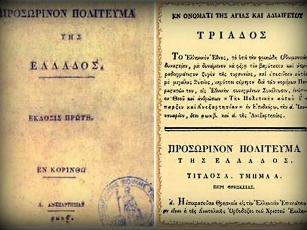Το Σύνταγμα αυτό ονομάστηκε ΠΡΟΣΩΡΙΝΟ ΠΟΛΙΤΕΥΜΑ ΤΗΣ ΕΛΛΑΔΟΣ και είχε ενιαύσια ισχύ. Βασικοί άξονες του Πρώτου Ελληνικού Συντάγματος της Επιδαύρου ήταν ότι η Χριστιανική θρησκεία ήταν η «επικρατούσα εις την Ελληνικήν επικράτειαν». Οι εξουσίες είναι τρεις ΒΟΥΛΕΥΤΙΚΟ-ΕΚΤΕΛΕΣΤΙΚΟ-ΔΙΚΑΣΤΙΚΟ  «Όλοι οι Έλληνες εισίν όμοιοι  ενώπιο των νόμων, και εις όλα τα αξιώματα και τιμάς έχουσι το αυτό δικαίωμα» 2