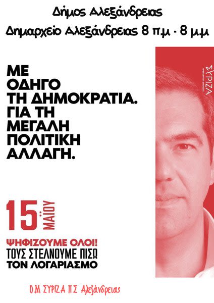 Για τον ευρύτερο Δημο Αλεξάνδρειας η εκλογική διαδικασία θα γίνει στο Δημαρχείο (ισόγειο) απο τις 8π.μ μέχρι τις 8μ.μ. Καλούμε σε μαζική συμμετοχή στην εκλογική διαδικασία όλους τους προοδευτικούς πολίτες του Δήμου μας ,έτσι ώστε να δυναμώσουμε τον ΣΥΡΙΖΑ -Π.Σ και να στείλουμε ισχυρό το μήνυμα της επερχόμενης πολιτικής αλλαγής που εχει αναγκη ο τόπος μας και η ελληνική κοινωνια.