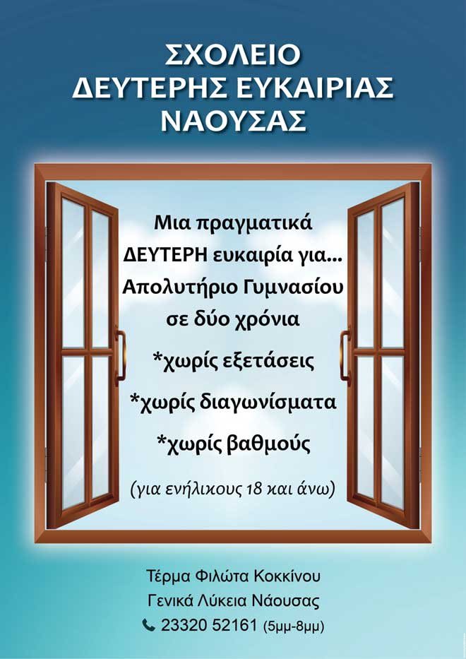 Σχολείο Δεύτερης Ευκαιρίας Νάουσας: Μέχρι τέλος Σεπτέμβρη οι εγγραφές